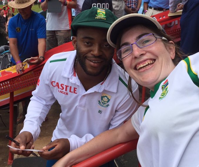 Also, sleep schedules. She was the kind of person who, when she woke up, couldn't get back to sleep. This was always incomprehensible to me. Sleep is about my favourite thing, and I'm sure it annoyed her sometimes how late I'd always get up. She used to wake up in the middle of the night to listen to international cricket matches on the radio. Cricket was one of her very favourite things. On Twitter just about everything she said was about cricket. Here's a selfie she managed to get with Temba Bavuma.